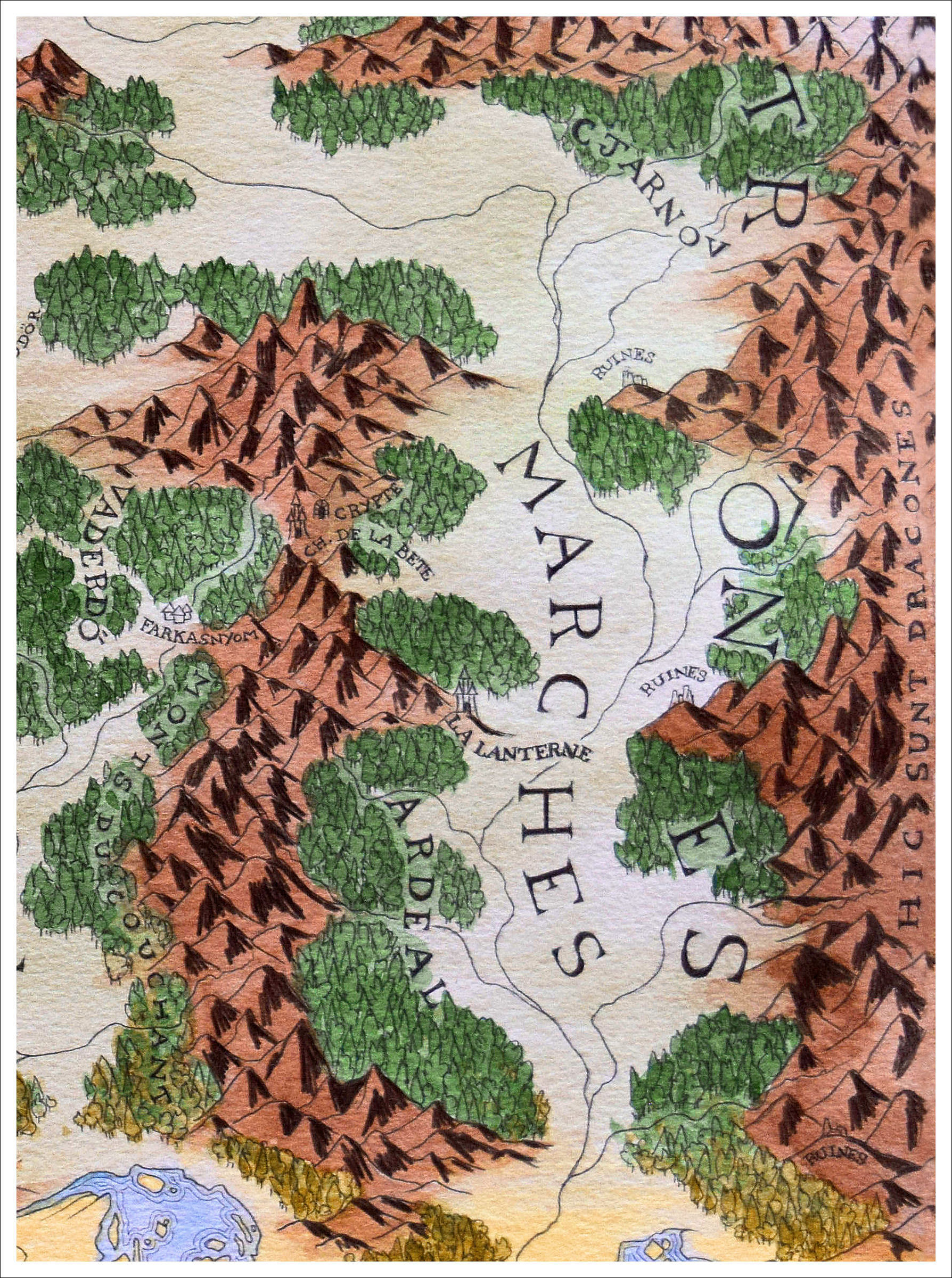 Vous remarquez immédiatement que cette carte est un peu particulière, et diffère de celles avec lesquelles vous êtes sûrement familiers. Ce que vous avez devant vous ne se préoccupe pas du détail des nombreuses entités politiques et du tracé de leurs frontières, des routes, ou même des villes au cours de la période décrite dans MUTATIS MUTANDIS. Toutes ces choses, vous le savez, se trouvent aisément aujourd’hui dans n’importe quel bon ouvrage d’histoire. À ce qu’il vous semble, cette carte créée pour les bénéfices de l’exposition se concentre davantage sur les lieux qui ont servi de décor au récit établi par Gianni di Lorena, ou du moins, qui sont mentionnés dans ses pièces. S’y trouvent localisés, par exemple, divers bâtiments ne figurant sur aucune mappemonde que vous avez pu voir, soit parce qu’ils sont ordinairement trop petits pour être mentionnés à l’échelle d’un continent, soit, vous le devinez, parce qu’ils sont toujours demeurés secrets.
