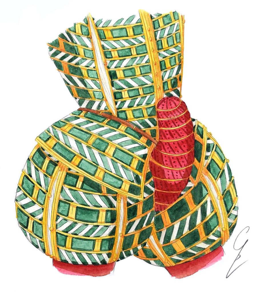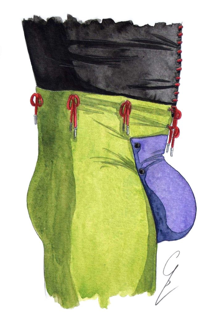 Comme je l’ai mentionné plus haut, Du côté de la forme, cette nouvelle itération prend l’apparence d’une grosse escarcelle, car aucun des simples triangles de tissu de la fin de la Désunion ne serait en mesure de contenir les nouveaux arguments masculins. Durant les décennies 2030-2040, certains pénis atteignent encore de telles proportions, cependant, que cette bourse replète n’abrite que les testicules, allongeant sur l’avant une sorte de long « nez » nécessaire à enclore l’extrémité du membre (Fig. 2).