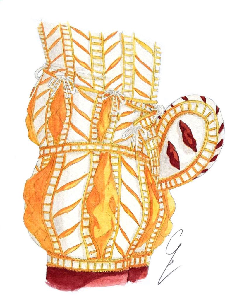 Une pièce très particulière existe dans certains royaumes du Ponant Oriental : la braguette apotropaïque dite « en gargouille » ou « en bestion ». De profil oblique, elle est brodée, piquée et cousue de manière à représenter une bête monstrueuse ou chimérique – dragon, gargouille, griffon, serpent, etc. –, dont la tête coïncide avec celle de la braguette (Fig. 21).