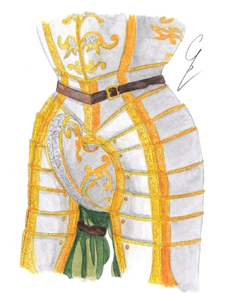 La première est, à nouveau et sans surprise, l’équipement militaire. Tandis que l’empire du Voile d’Aphrodite se dissout et que les travers humains refont surface, les outils de la guerre ressortent des placards où ils ont été remisés depuis la fin de la Désunion. S’ils n’ont plus la taille faramineuse des premiers temps, les membres virils sont, néanmoins, bien plus conséquents qu’avant la tombée du Voile, et les armures doivent relever le même défi que les chausses quelques générations plus tôt : réussir à loger d’énormes engins là où la place manque désormais. Forgerons et armuriers pallient ce problème en dotant les armures d’une coque protubérante à l’entrejambe qui, bien que peu pratique, a cependant l’avantage de protéger les parties sensibles (Fig. 6). Seuls les cavaliers refusent de la porter, s’affublant d’un dispositif spécial, consistant en un harnais de cuir porté sur les épaules, destiné à soulever et plaquer la braye contre le bas-ventre, permettant de ce fait une montée en selle sans douleurs.