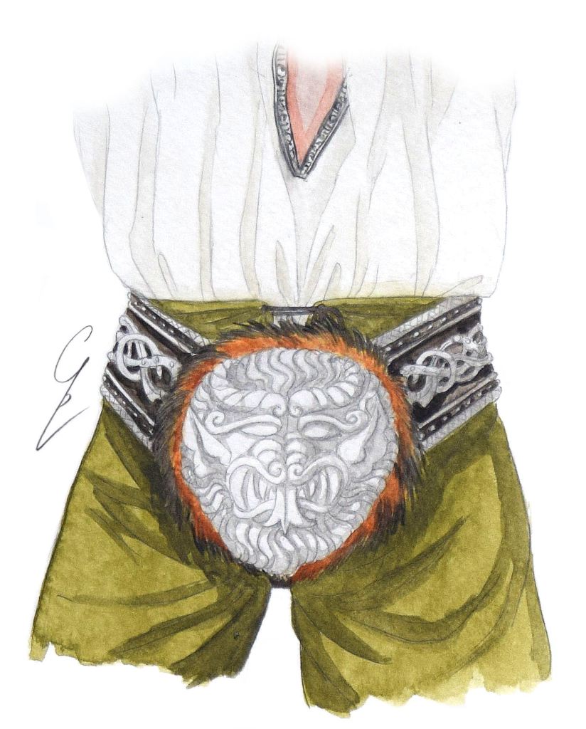S’il est peu probable que le peuple boréen, dans les lointaines contrées nordiques, ait connu la braye ou les fantaisies des lansquenets, le Voile d’Aphrodite a néanmoins touché ses mâles, qui ont dû avoir recourt à un stratagème afin de ranger leur attirail et de le protéger des rudesses de l’hiver. Celui-ci ressemble à une sorte de harnais muni sur l’avant d’une grosse bourse entièrement doublée et bordée de fourrure, couverte d’une coque de métal travaillée en forme de visage monstrueux et grimaçant. À l’instar des braguettes du Ponant Oriental, l’usage en est supposé apotropaïque. Les rares Ponantins ayant eu l’occasion de voir ce harnachement de près l’ont assimilé à leurs braguettes, dès lors le nommant « braguette à la diable » (Fig. 24).