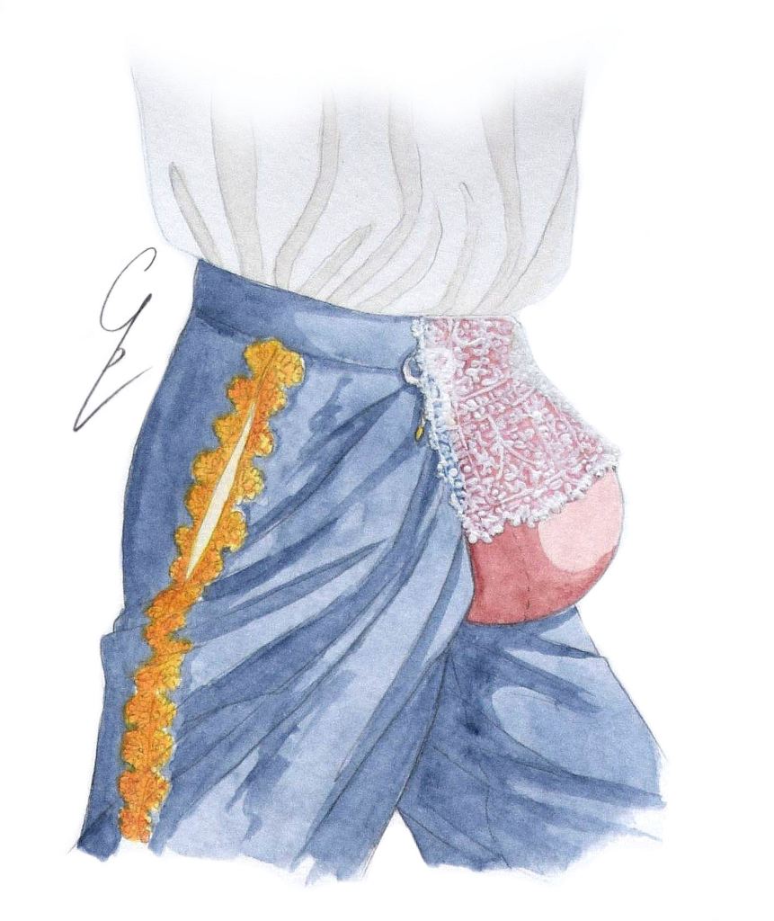 Cette pratique de l’échancrure des dessous se poursuit jusque dans les années 2400, alors même que les chausses laissent place à la combinaison hauts-de-chausses/bas-de-chausses. Ainsi, sous la fermeture centrale des premiers – qu’il s’agisse de boutons ou laçages –, la fente permettant de les enfiler est laissée ouverte afin de laisser passer le sexe, qui est alors recouvert par la braguette venant se fixer par-dessus cette même fente et la camoufler. Je pense aux pantalons, de nos jours, qui ont remplacé le haut-de-chausse : par comparaison, c’est tout comme si l’on fermait le bouton de ceinture tout en laissant ouverte ce que nous appelons aujourd’hui « braguette » – mais qui n’est qu’une série de boutons permettant de clore le devant du vêtement –, et que l’on sortait par là son pénis avant de le recouvrir d’une poche de tissu. Évidemment, le Voile d’Aphrodite s’est depuis longtemps dissipé, et les attributs mâles ne nécessitent plus une pièce en propre afin d’être casés quelque part, et de ne pas ballotter aux yeux du monde. Mais il y a fort à parier que si le Voile ne s’était pas éteint, la braguette aurait évolué ainsi.